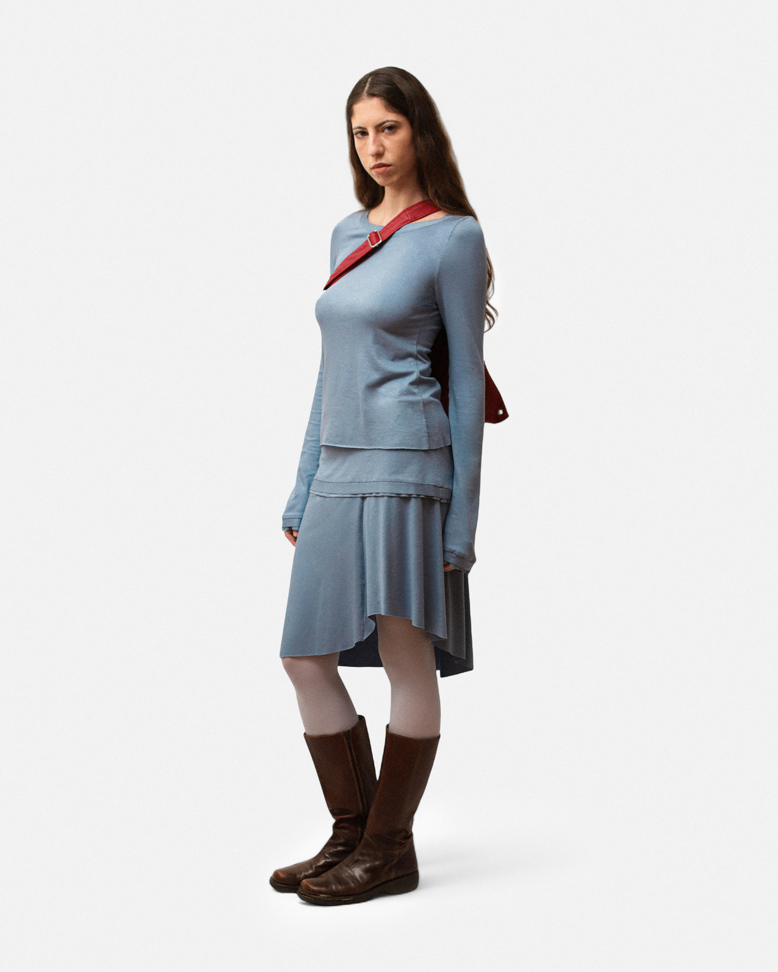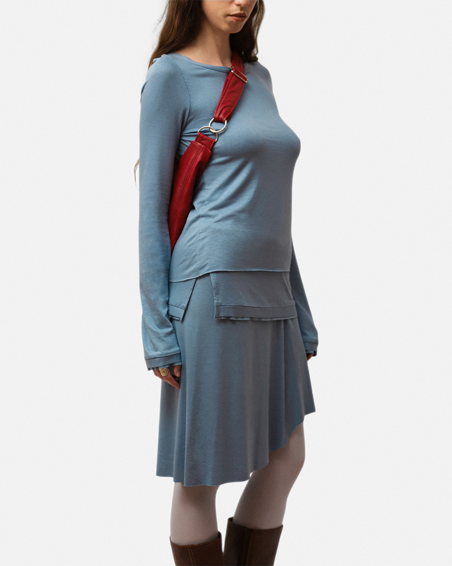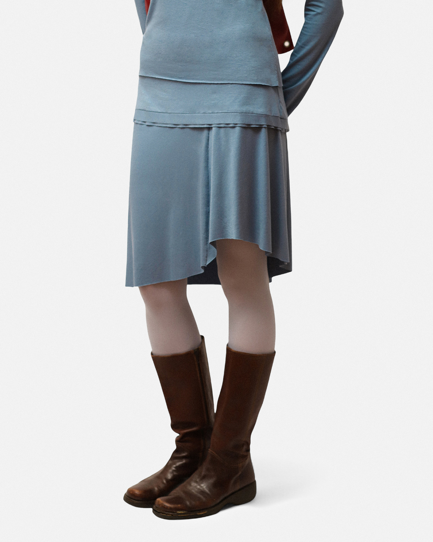 Faldilla midi asimètrica que arriba fins a sota el genoll. Té una sobre-faldilla mini a l’alçada dels malucs. Per a major comoditat la cintura té goma. Té una bona caiguda fluida.