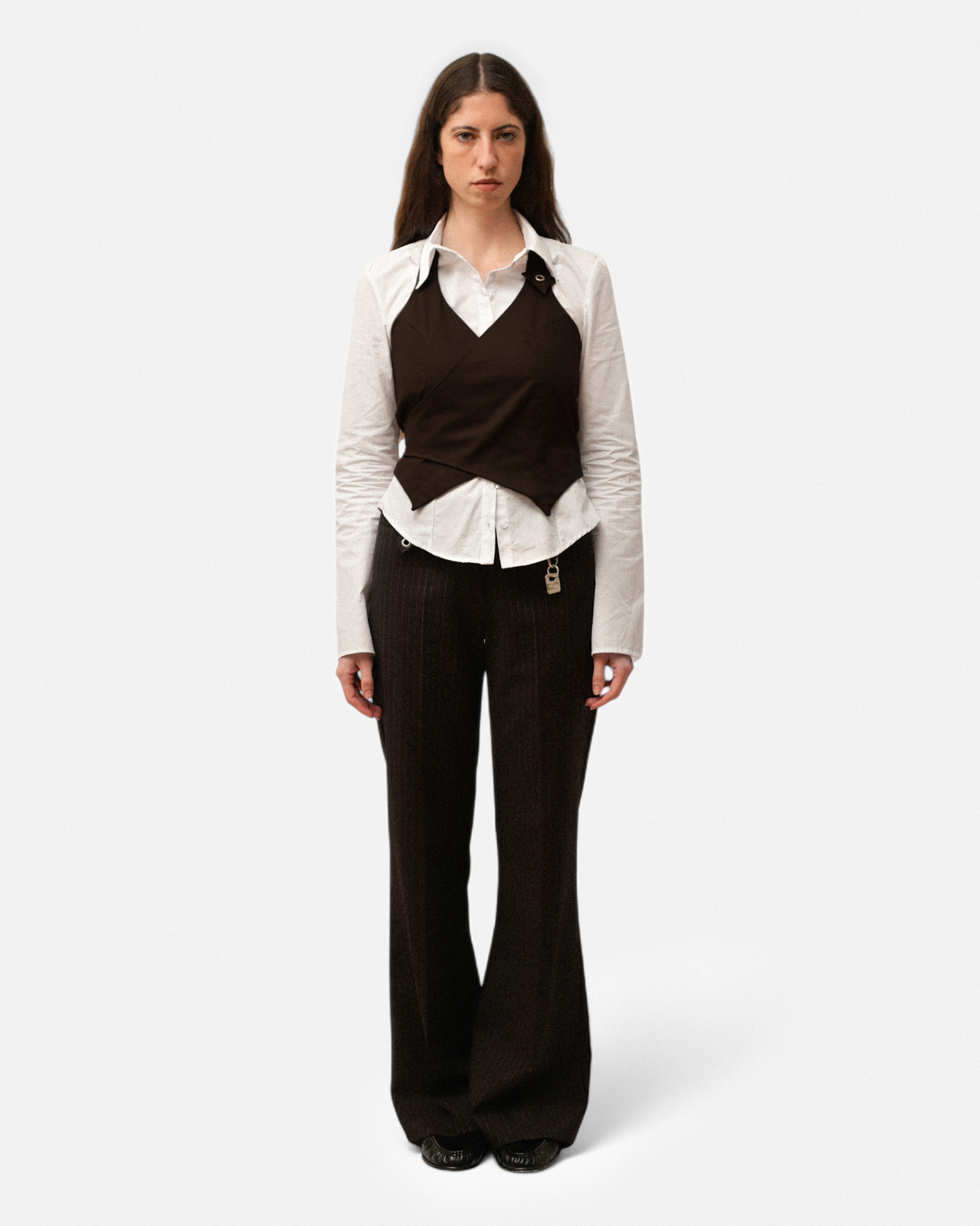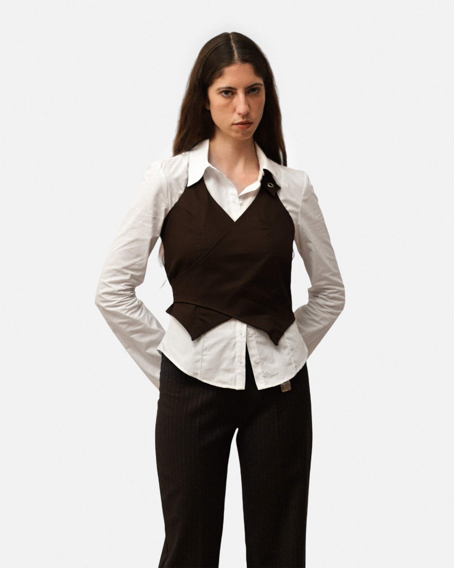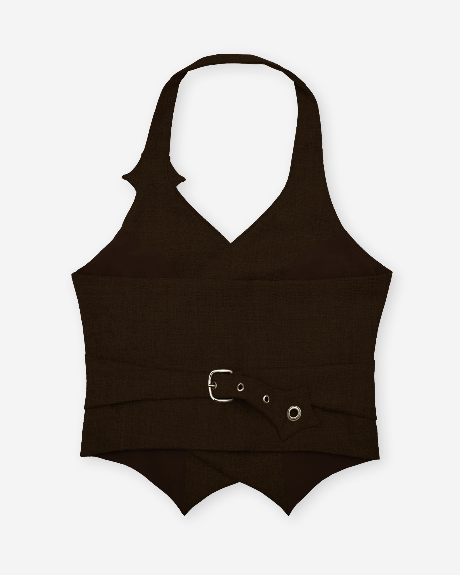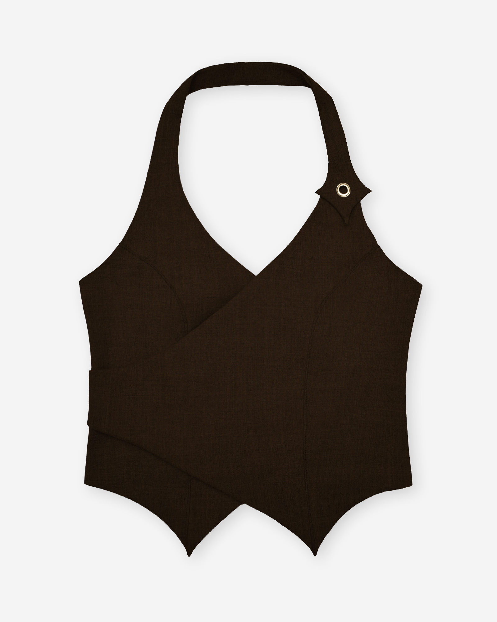 Armilla de llana freda italiana dels anys 90s. És de tirants tipo halter i d’escot en V. És un top creuat al davanter i que té una sivella de tancament a l’esquena.