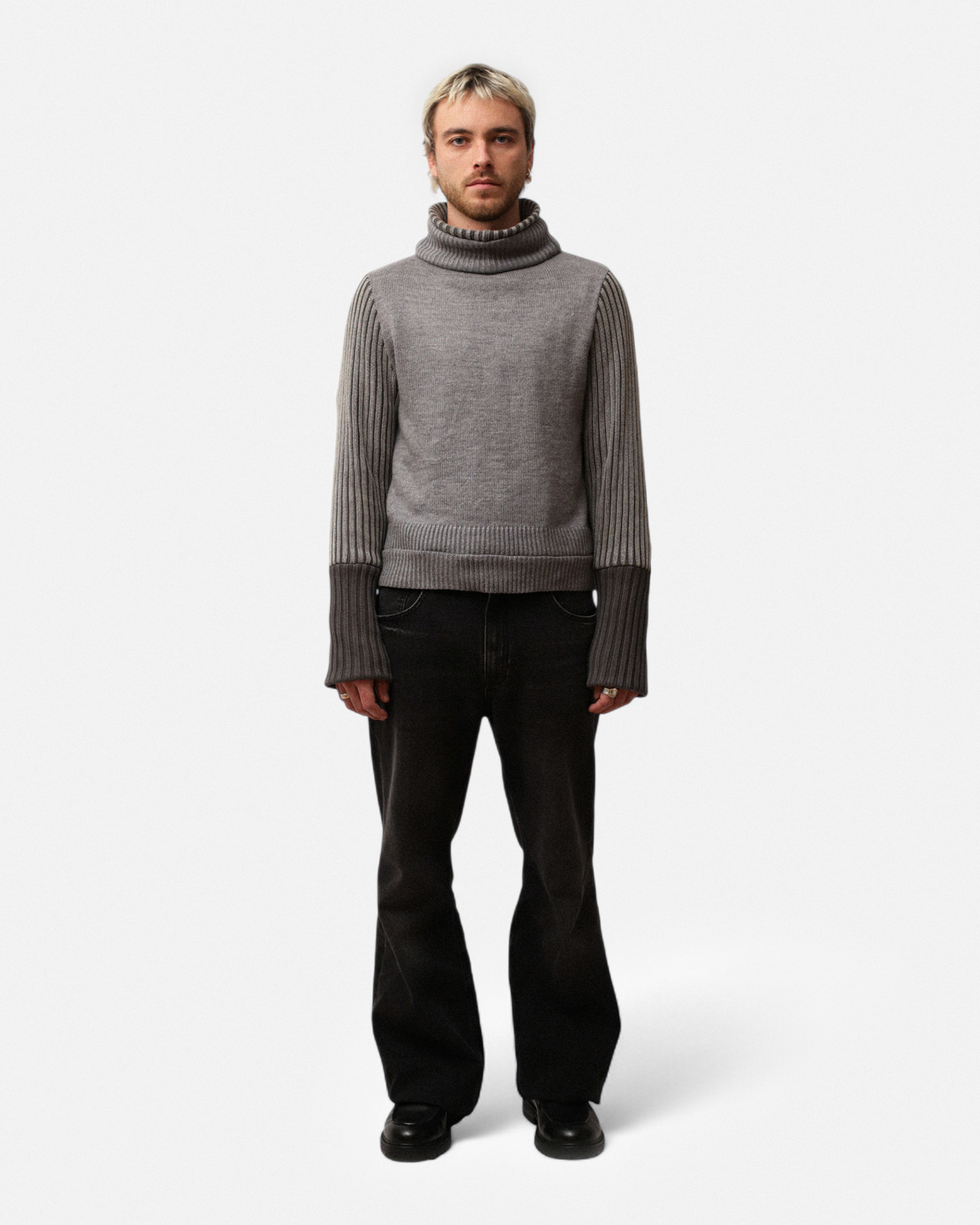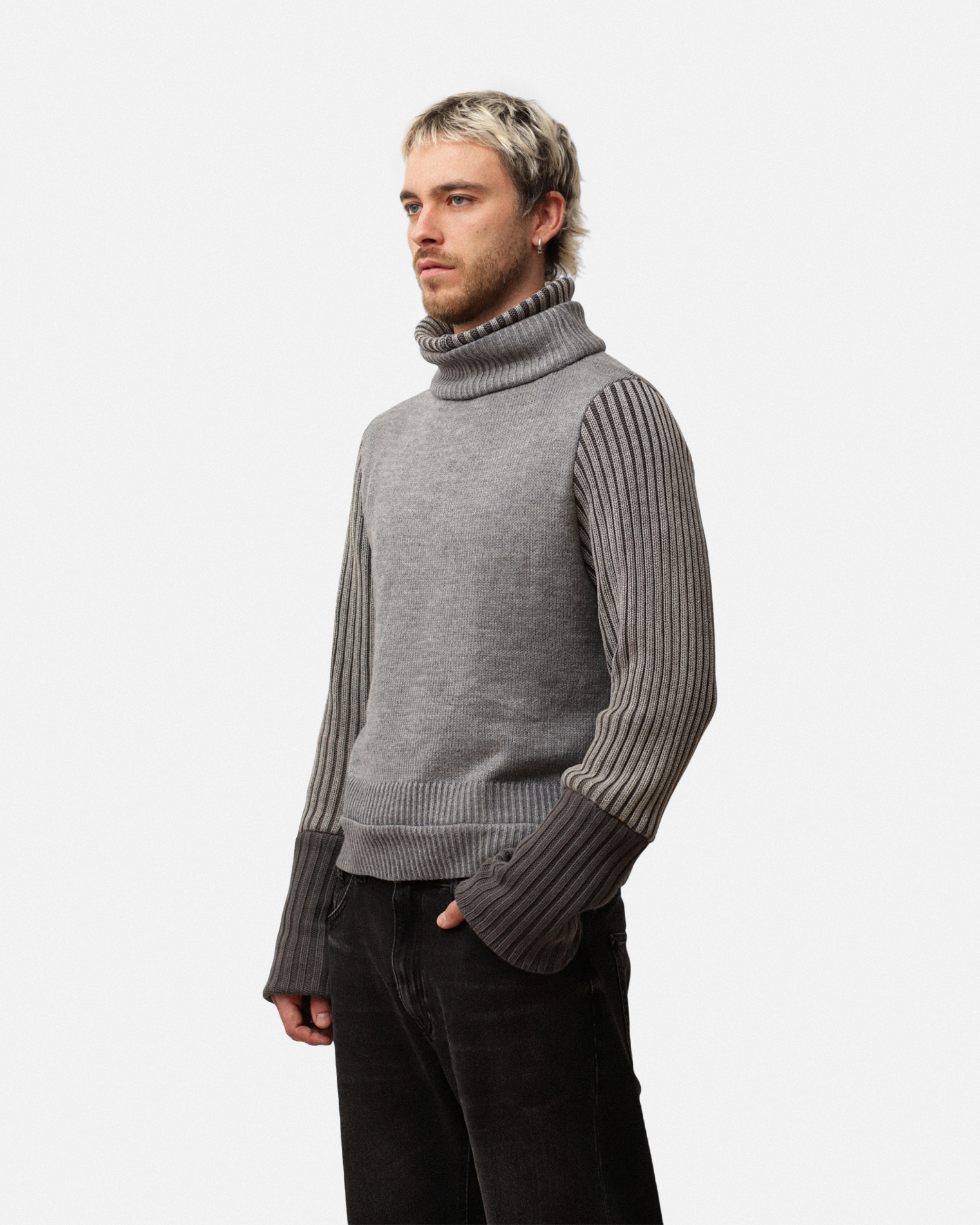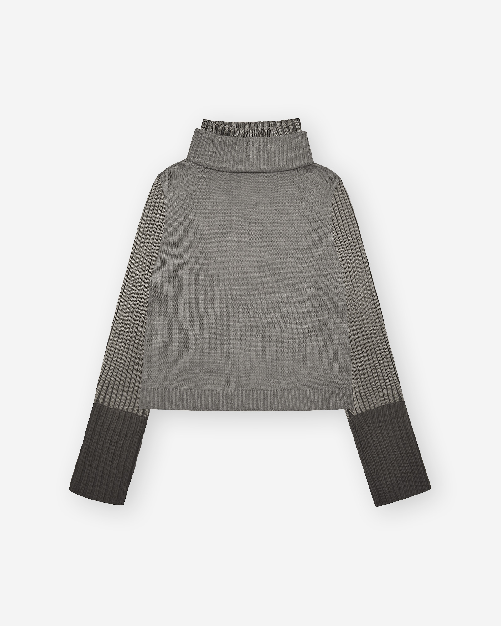 Jersey de cotó confeccionat a partir de jerseis reciclats, per aquest motiu cada peça és única. El jersei boxy té un doble coll alt i uns punys amples.