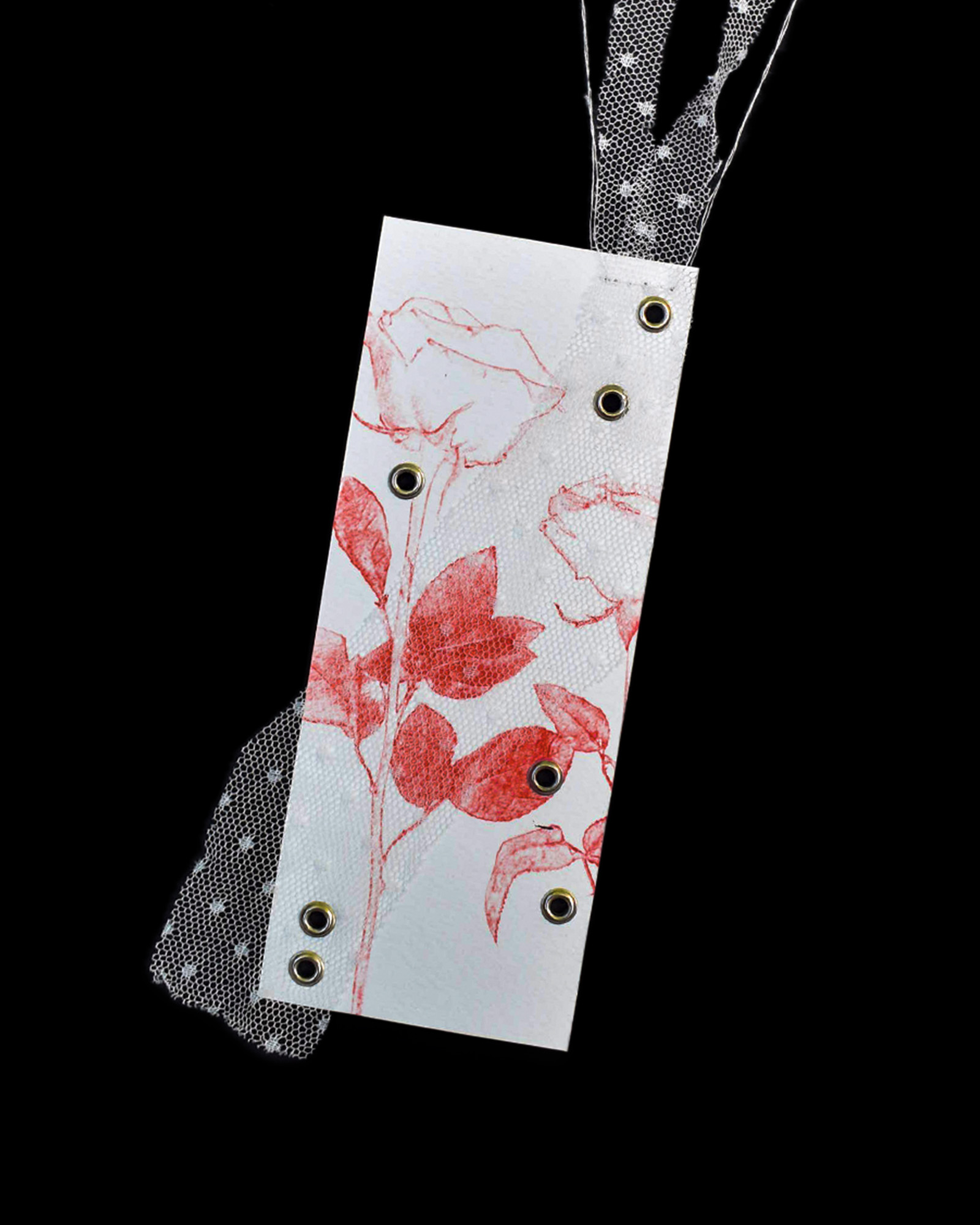 Punt de llibre imprès amb estampat de roses. Incorpora ullets metàl·lics i detalls amb teixits residuals. Cada peça és única i feta a mà.