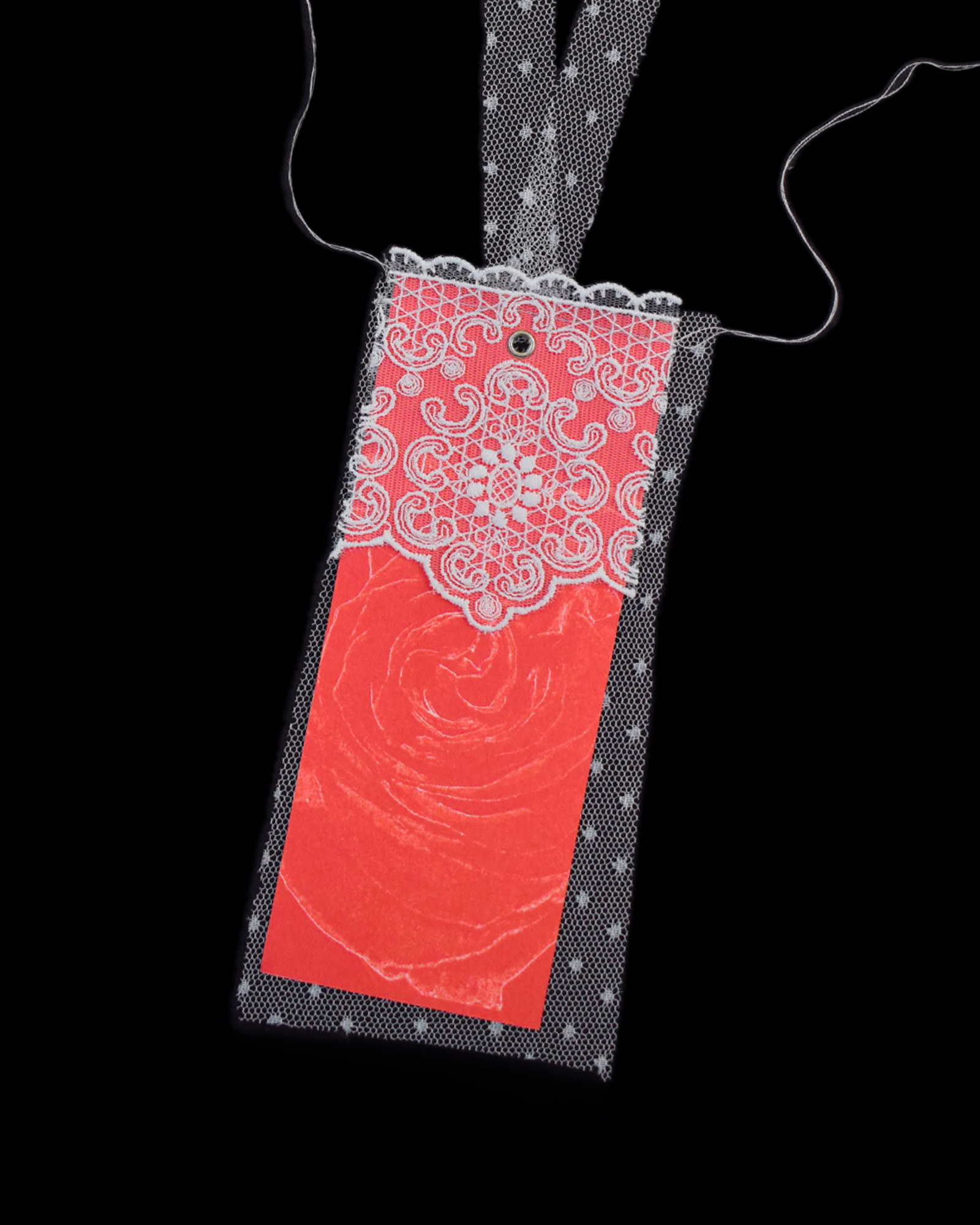 Punt de llibre imprès amb estampat de roses. Incorpora ullets metàl·lics i detalls amb teixits residuals. Cada peça és única i feta a mà.