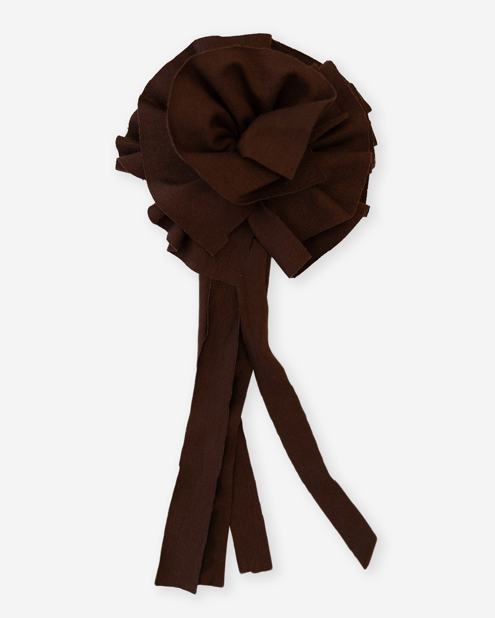 Fermall en forma de rosa fet amb restes de teixit. Porta un imperdible a la part posterior per a la fixació. Té cintes llargues i fluides que cauen.