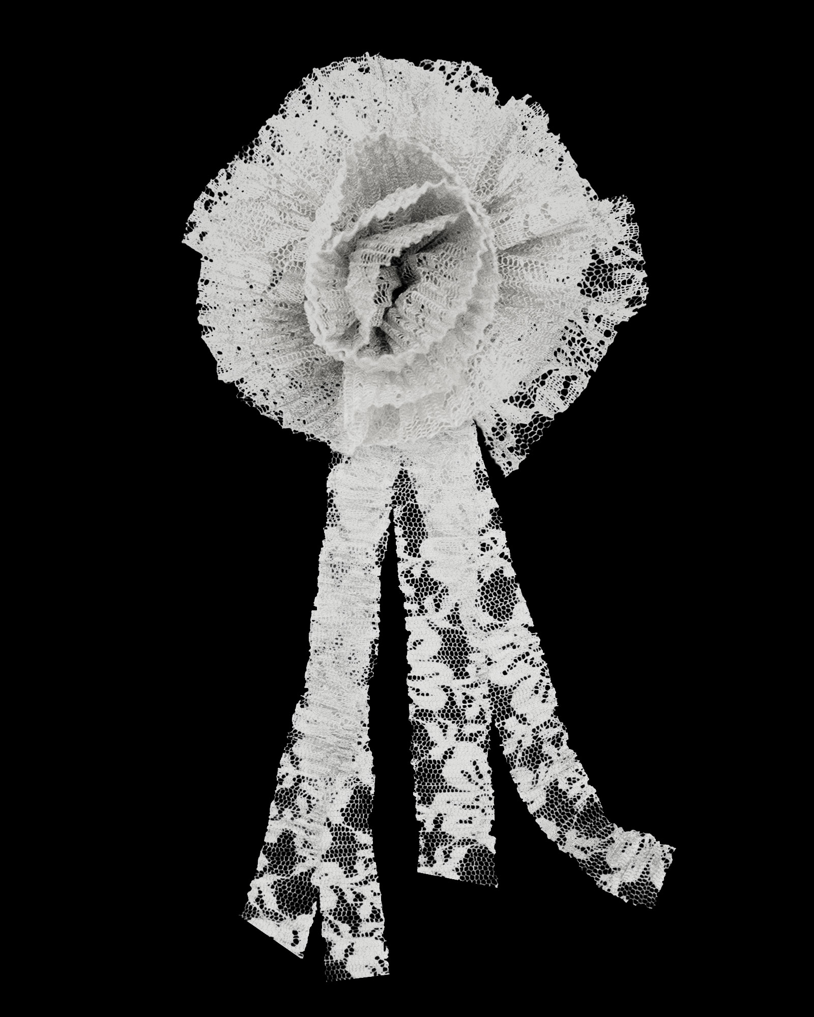 Fermall en forma de rosa fet amb restes de teixit. Porta un imperdible a la part posterior per a la fixació. Té cintes llargues i fluides que cauen.